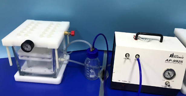 說明:標準魯爾接頭設計,兼容所有SPE小柱,魯爾Flash色譜柱;面板上帶有一負壓表,方便觀察,通過側面的泄壓閥進項調節壓力(由于工業產品限制,最低可泄壓至0.01Mpa,如果想泄壓到0,可以調節24孔中的任意一孔的流速調節閥)。帶有4個可以調節高度的支撐腿。